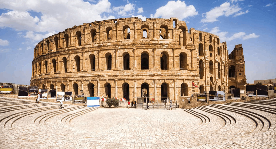 از دقیات تا الجم، تونس پر از بناهای رومی سالم و باشکوه است. آمفی‌تئاتر الجم همچون حلقه‌ای سنگی در دل بیابان ایستاده و هنوز هم قدرت معماری رومی را یادآوری می‌کند.